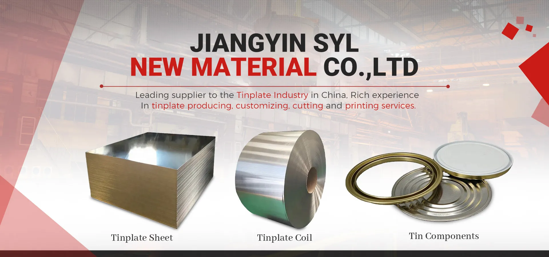 layna_xu@shangyulong.com As an export-oriented enterprises, we have more than 20 years experiences in delivering top-quality steel products. Our extensive range includes electrolytic tinplate sheets/coils, printed tinplate sheets, coated tinplate rolls, tin-free steel, and various related components.
